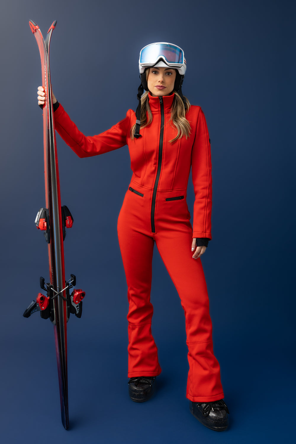 Overall de ski rojo con ajuste impecable y máximo confort. Confeccionado en tejido Schoeller de cuatro vías con flexibilidad y efecto segunda piel, repelente al agua y diseñado para rendir en las pistas con estilo.