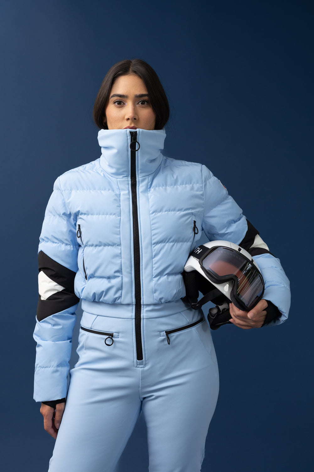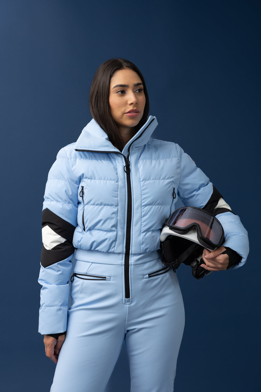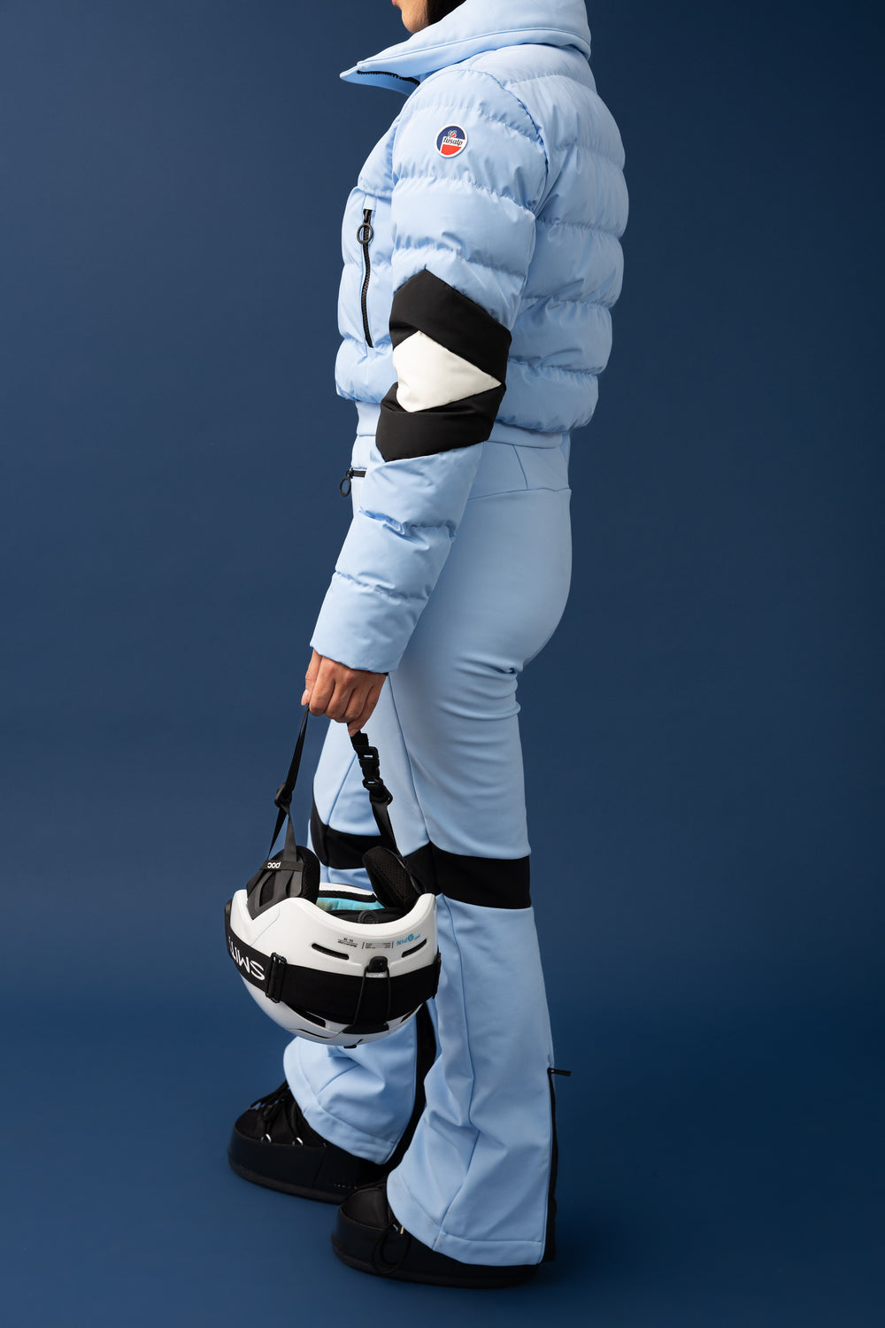 Color baby blue, medio cierre en la parte delantera, rodilleras incorporadas, multiples bolsas con cierre, puños con cierre autoadherente.