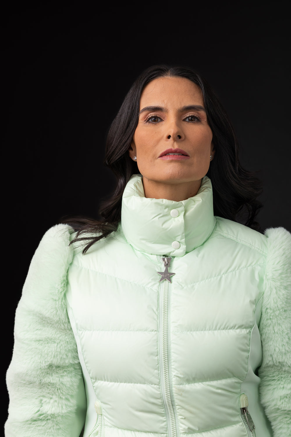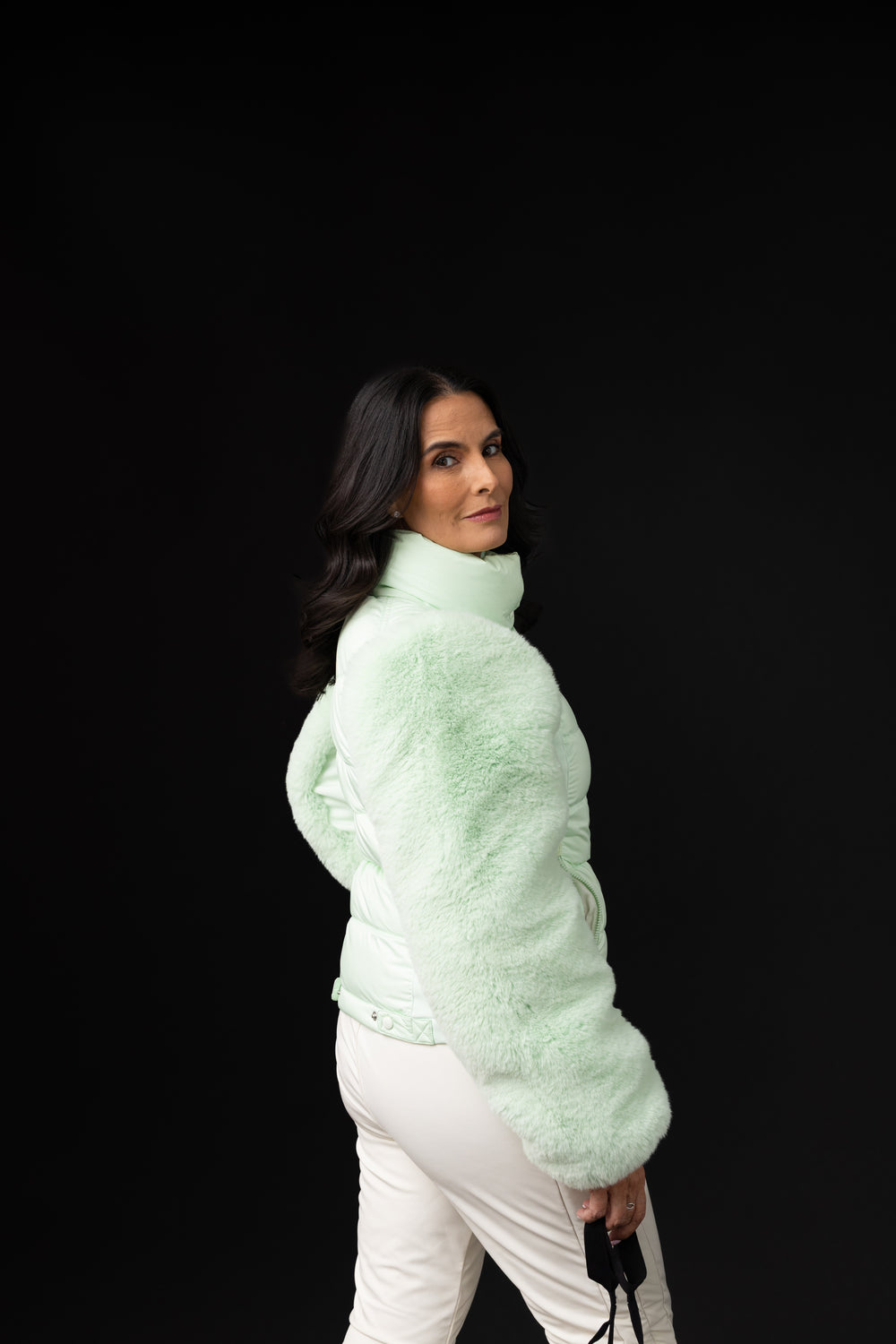 Color verde con mangas faux, es ideal para las pistas asi como para el aprés ski, confeccionada con forro parcialmente reciclado y acabado anti-olor. Su aislamiento combina plumón de pato certificado RDS (90/10) con Primaloft, logrando calidez ligera y responsable. Incluye dos bolsillos externos, dos internos y puños de punto en las mangas. El shell mezcla poliéster, poliamida reciclada y elastano con membrana de 10,000 mm / 10,000 g/m²/24h según norma JIS, asegurando impermeabilidad y transpirabilidad.