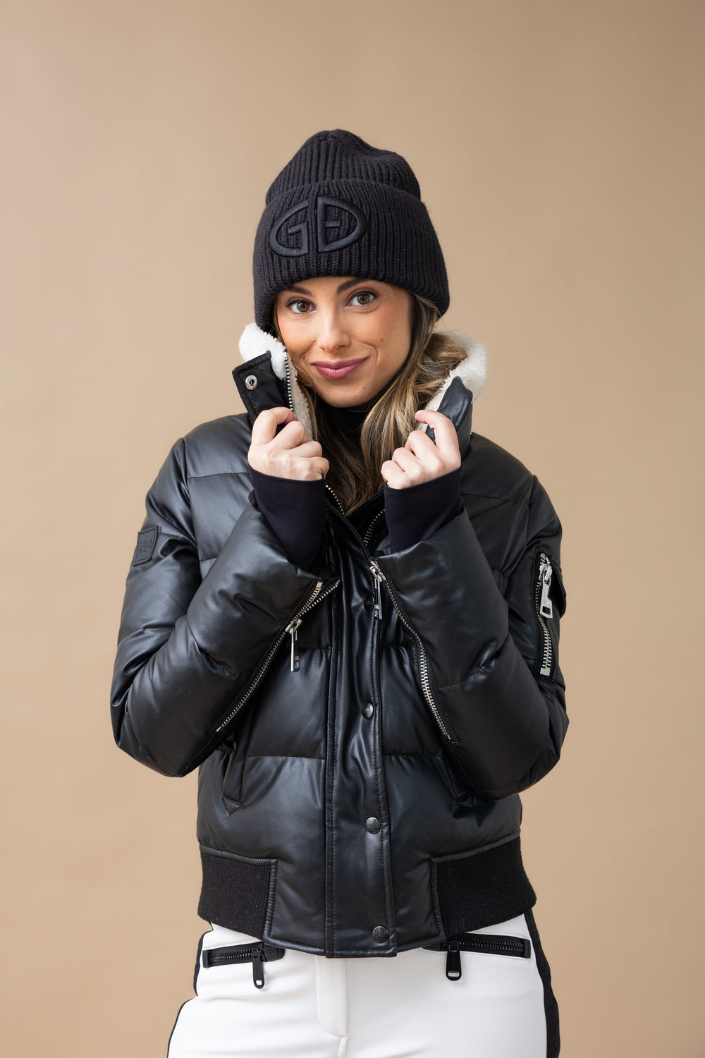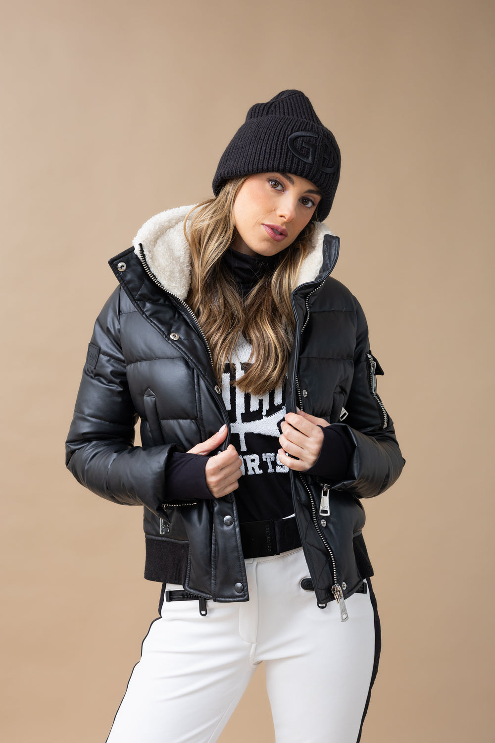 La Allegra Down Puffer Bomber Jacket de Sam. Está confeccionada en piel vegana resistente al viento y repelente al agua.