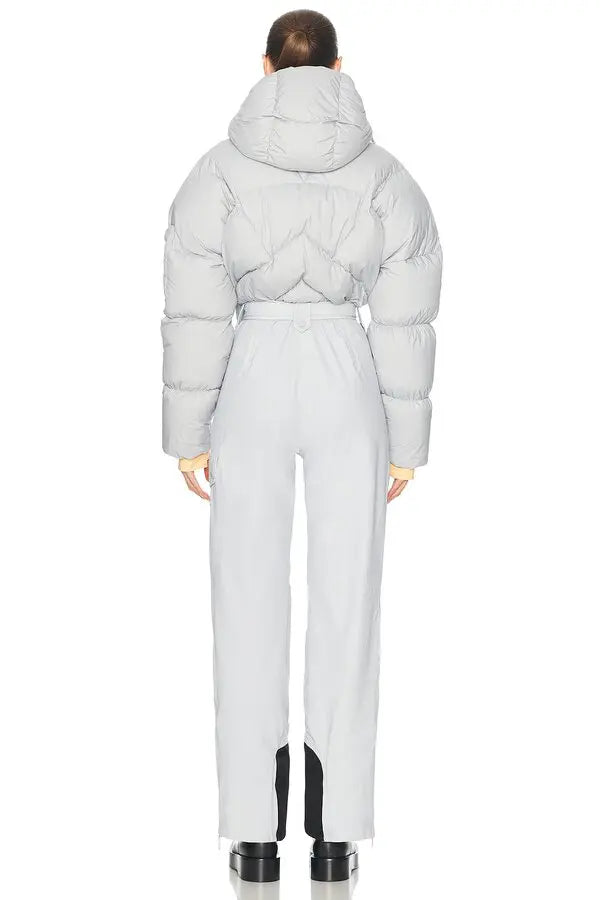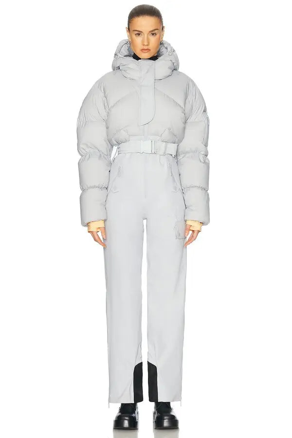 Color gris claro, relleno de plumón de pato, impermeable, diseño capitoneado, cierre con botones de presión y cierre en la parte de adelante, capucha con cordones, cierre en la manga para el ski pass, puños elásticos, cinturón, bolsas con cierre al frente, bolsas tipo cargo en los laterales, puños con cierre, forro completo, corte recto.