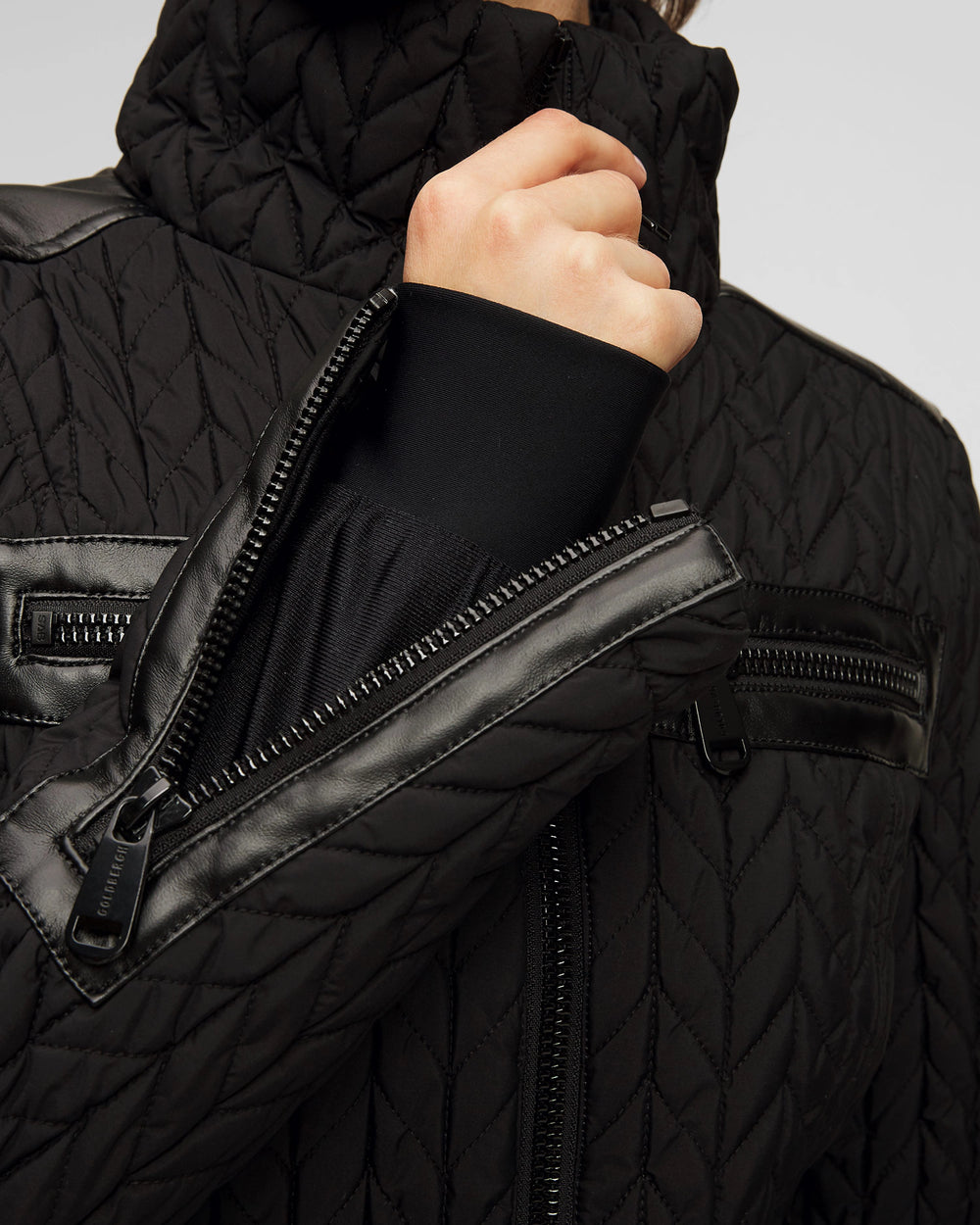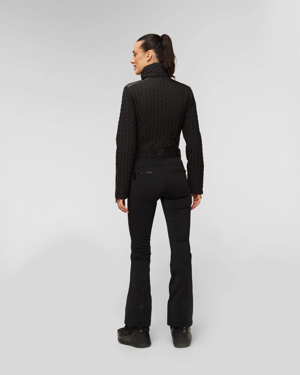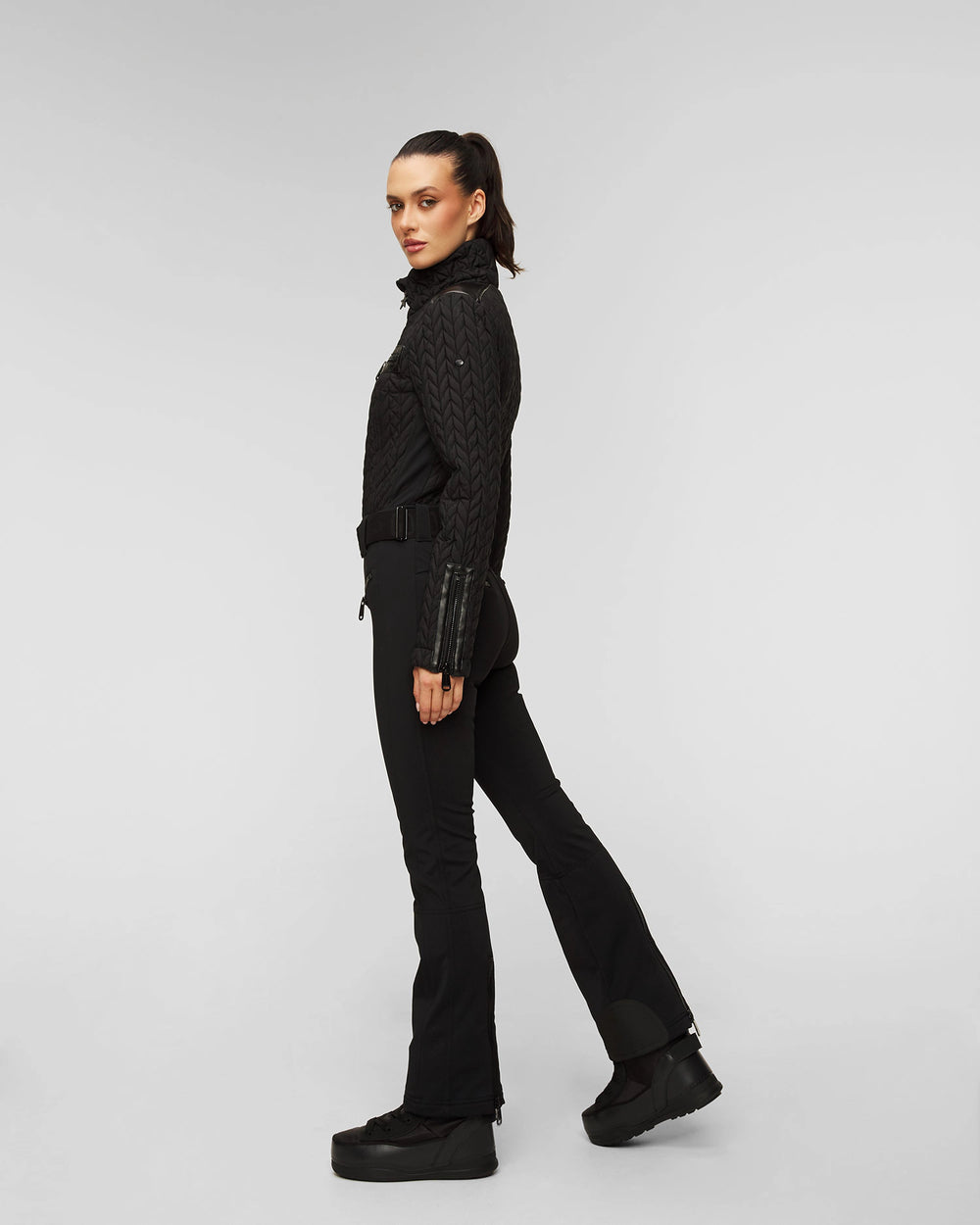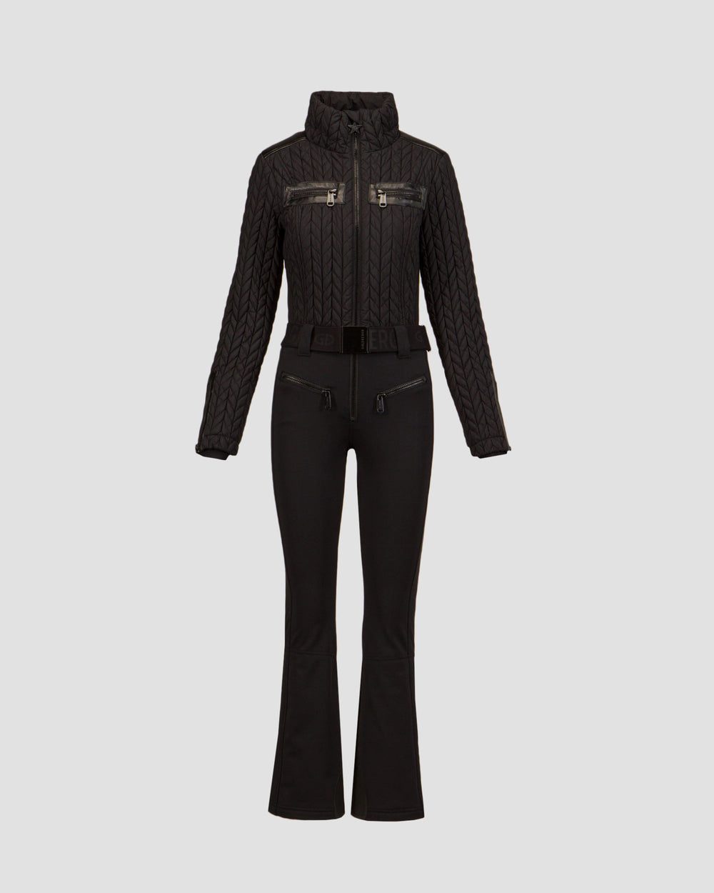 Suit negro con detalles en piel sintética, ajusta al cuerpo y frente acolchado con plumón comprimido. Incluye cinturón ajustable, 6 bolsas , 2 internas + lift pass pocket.