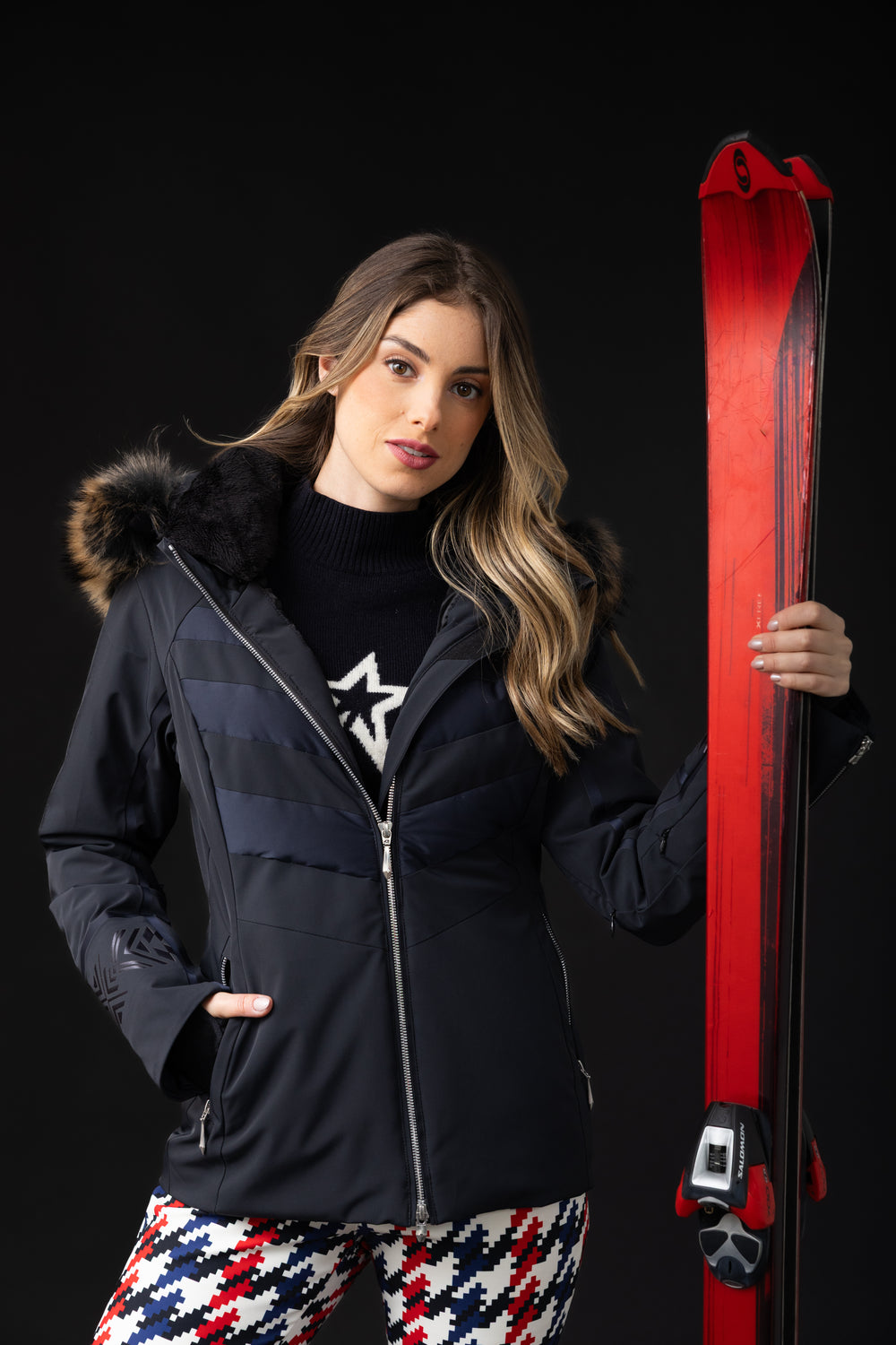 Una chamarra azul marino y negra con real fur en el gorro, combina 4-Way Stretch y Satin Stretch en un balance entre mate y brillo que la hace sofisticada y moderna. El aislamiento híbrido de plumón y Thinsulate ofrece calidez ligera justo donde la necesitas. Diseñada para acompañarte en cada movimiento, incluye detalles prácticos como snow skirt, ventilación lateral, bolsillo para ski pass y cremalleras en los puños. Tiene detalles de brocados en las magas y parte de la chamarra.