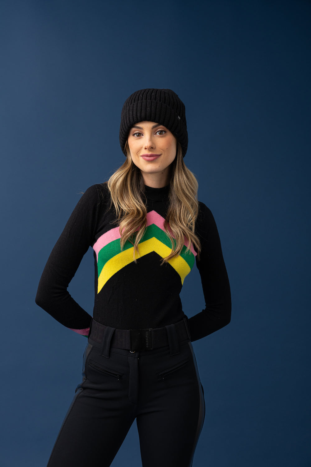 Este suéter destaca por su diseño retro estampado chevron, hecho de lana Merino, lo que garantiza calidad, suavidad y rendimiento térmico. Se ajusta al cuerpo