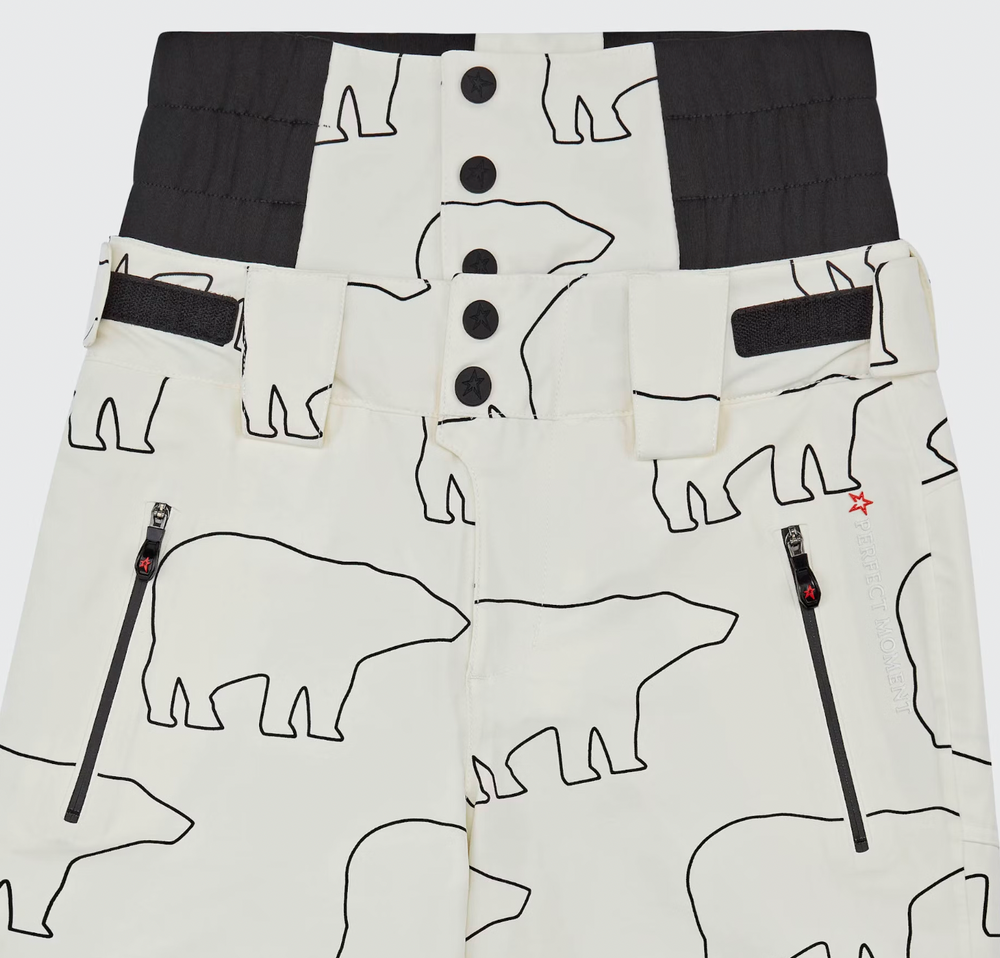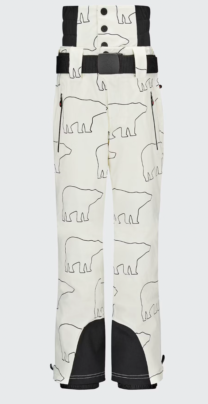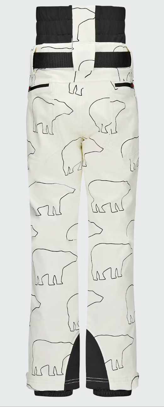 Pantalón de ski técnica en blanco y negro con. Súper ligero, impermeable y acolchado con pluma para máximo calor. Forro con print de osos polares, tirantes y peto con bolsillos con cierre para llevar todo seguro.