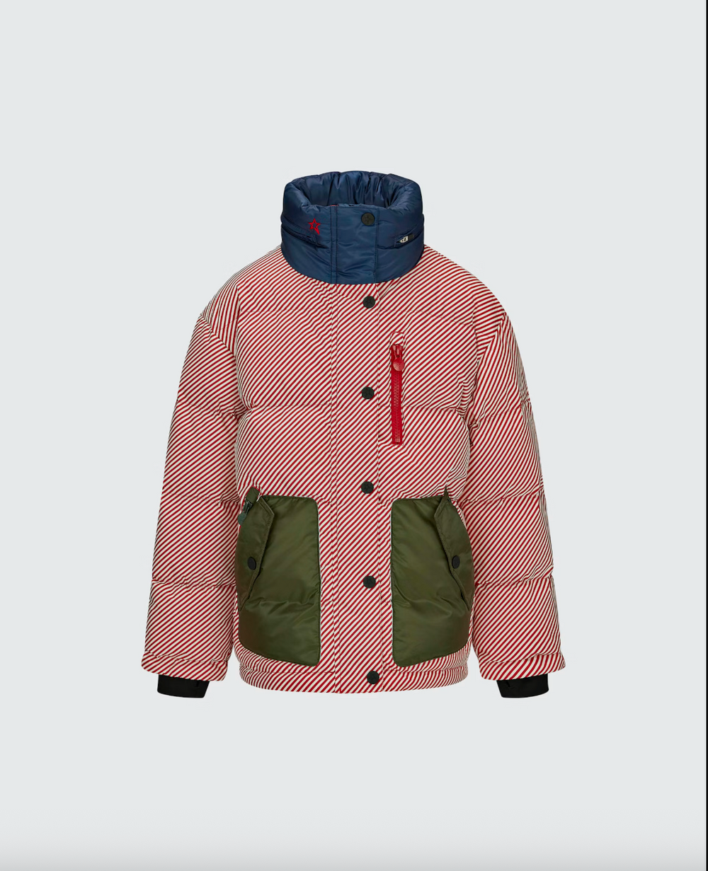 Chamarra de ski para niños en pinstripes, repelente al agua y acolchada con pluma 700-fill para máximo abrigo. Corte oversize a la cadera, capucha compatible con casco que se guarda, falda anti-nieve ajustable y bolsillos para pase, goggles y más. Detalles de parches en codos y puños acanalados para estilo y protección extra.