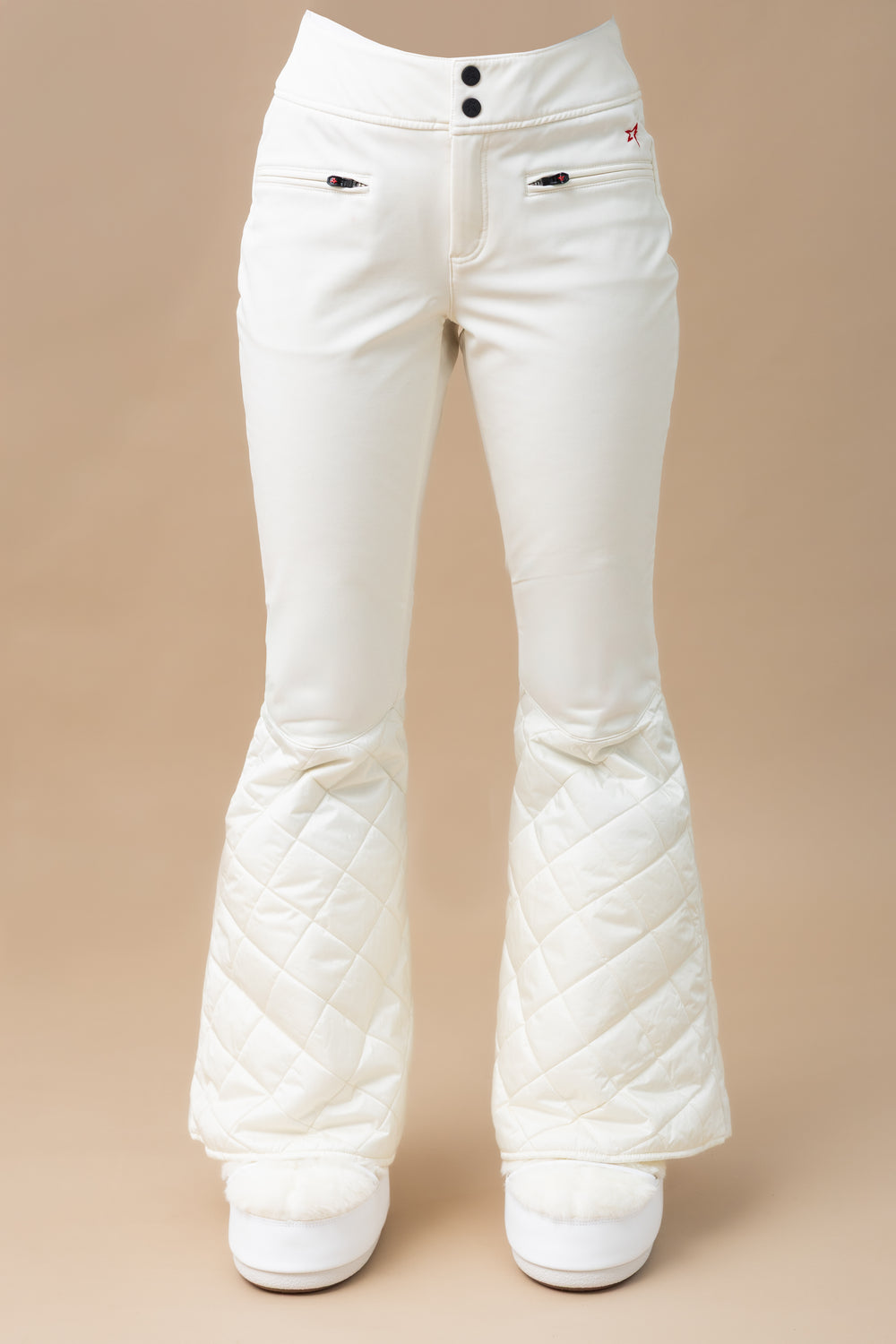 Pantalón blanco, jersey stretch, diseño a paneles. Detalle de capitonado en rombos, logo bordado, tiro medio, cierre y botón ocultos. Acampanado, dos bolsas laterales con cierre, cierres en el tobillo y forro tejido polar.