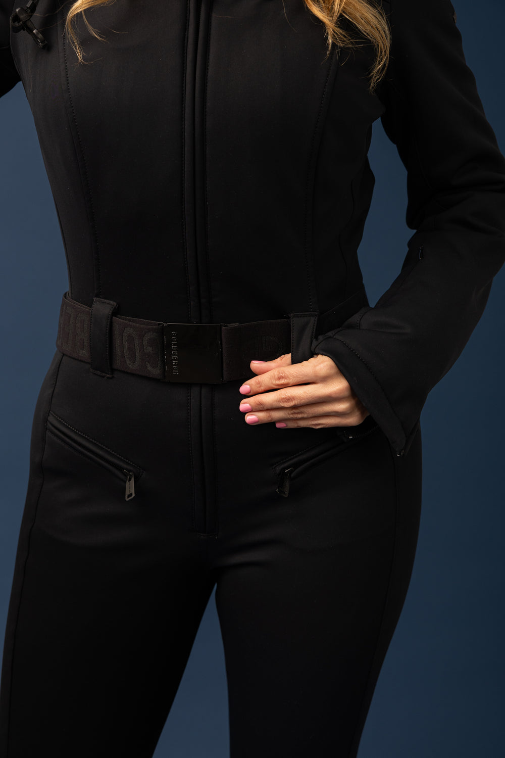 Suit negro, técnico con fit ultra favorecedor, gorro con faux fur y tejido elástico impermeable y cortaviento.